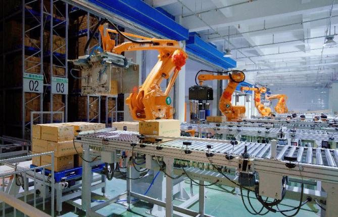 走进仓库,一排排码垛机器人正在高效运作,自动运输的货物穿梭其中,展现出一幅数智化生产的繁忙图景。