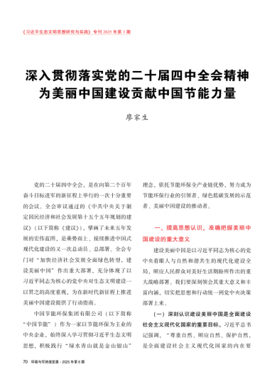 (一)深刻认识建设美丽中国是全面建设社会主义现代化国家的重要目标。习近平总书记强调,“尊重自然、顺应自然、保护自然,是全面建设社会主义现代化国家的内在要求”,要以美丽中国建设全面推进人与自然和谐共生的现代化。绿色发展是中国式现代化的鲜明底色。作为节能环保领域的骨干央企,中国节能必须始终坚持把美丽中国建设摆在强国建设、民族复兴的突出位置,把服务美丽中国建设作为践行“两个维护”的具体行动,坚决扛起生态文明建设主力军责任,持续为建设人与自然和谐共生的现代化贡献力量,奋力绘就全面推进美丽中国建设的新画卷。
