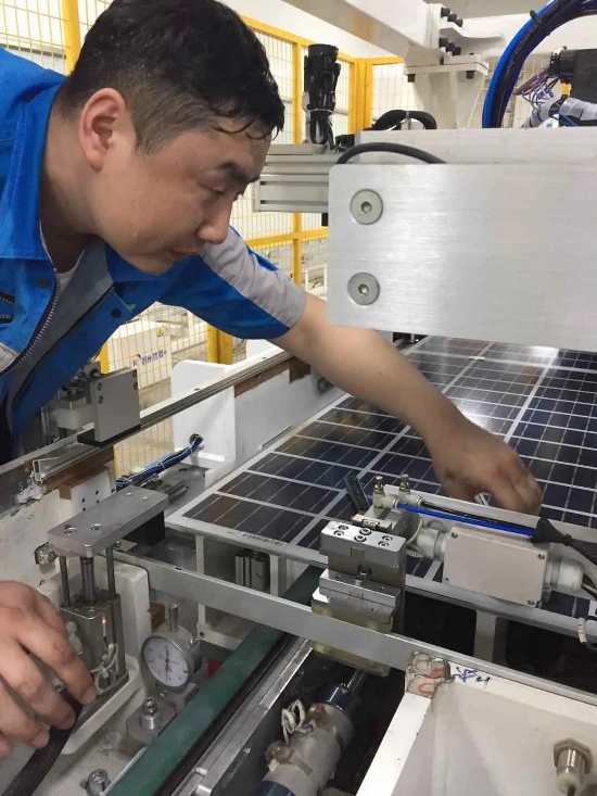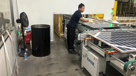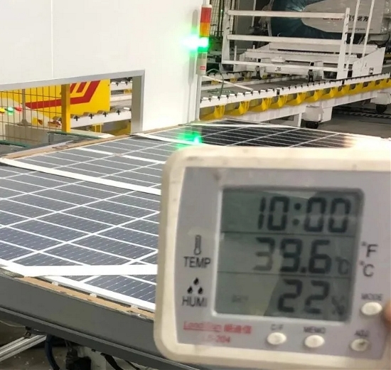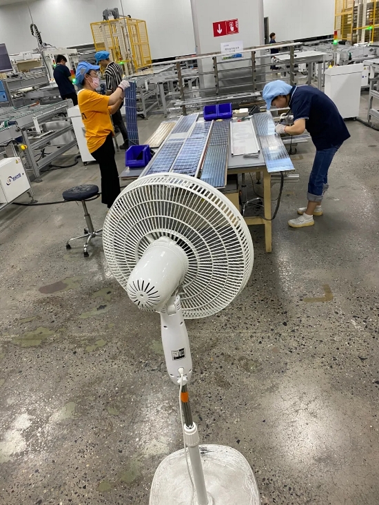 没条件,创造条件也要上。组件一车间二号线小牛多主栅焊接机因环境温度过高,生产设备人员想方设法,通过冰块、风扇对机器进行降温,保证生产;串焊返修工位,温度较高,但是员工们依然坚持返修工作。