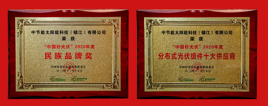 ?????? 凭借优秀的技术创新能力和品牌影响力,中节能太阳能镇江公司斩获“中国好光伏·2020年度民族品牌奖”、“中国好光伏·2020年度分布式光伏组件十大供应商”两项大奖。