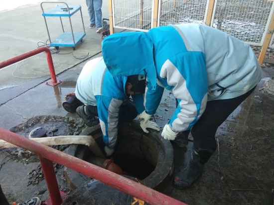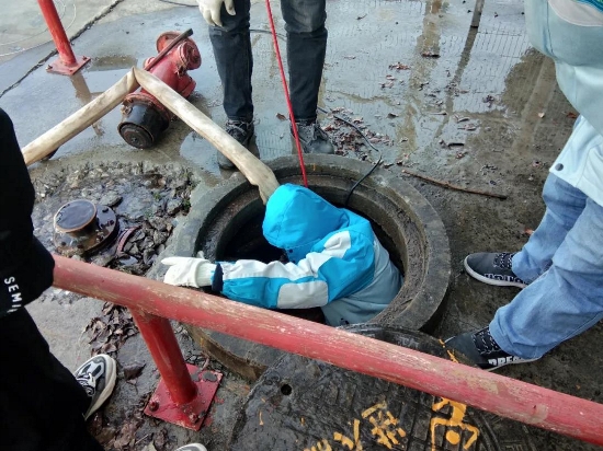 ????? 窨井内水一直上涌,必须先关闭窨井内阀门,但由于消火栓内水一直灌入窨井内,导致水无法抽干,只能带水进入窨井内关闭阀门。时值“二九”节气,又处化雪天气,寒风凌冽,如此恶劣的天气,在室外站上几分钟就会感到非常不适应,不管包裹得多严实,仍然感觉寒风刺骨,可抢修员工们却没有抱怨,各司其职,有条不紊的开展抢修工作。朱金飞一马当先,首先下到窨井里,找到阀门所在位置,马超紧跟其后,协助朱金飞将阀门附近水抽浅,两人齐心协力关闭阀门,部门其他员工积极配合,全力保障抢修。
