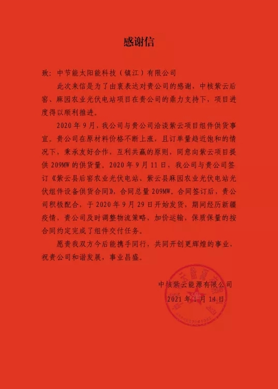 ? ? ? ?在信中,中核紫云能源有限公司充分肯定了镇江公司在合作中,秉承“客户第一”的原则,克服新冠疫情及原材料价格上涨等种种困难,积极协调、加价运输,保质保量完成组件交付任务,确保项目顺利推进的努力与成效。