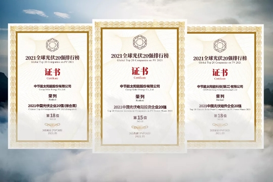 5月10日,由365光伏和365储能及智慧能源发起的“品牌强国 · 2021 中国碳中和高峰论坛暨2021全球光伏20强、中国储能20强排行榜发布会”在浙江杭州召开。中节能太阳能股份有限公司荣列“中国光伏电站投资企业20强”、“中国光伏企业20强(综合类)”排行榜,中节能太阳能科技(镇江)有限公司荣列“中国光伏组件企业20强”排行榜。