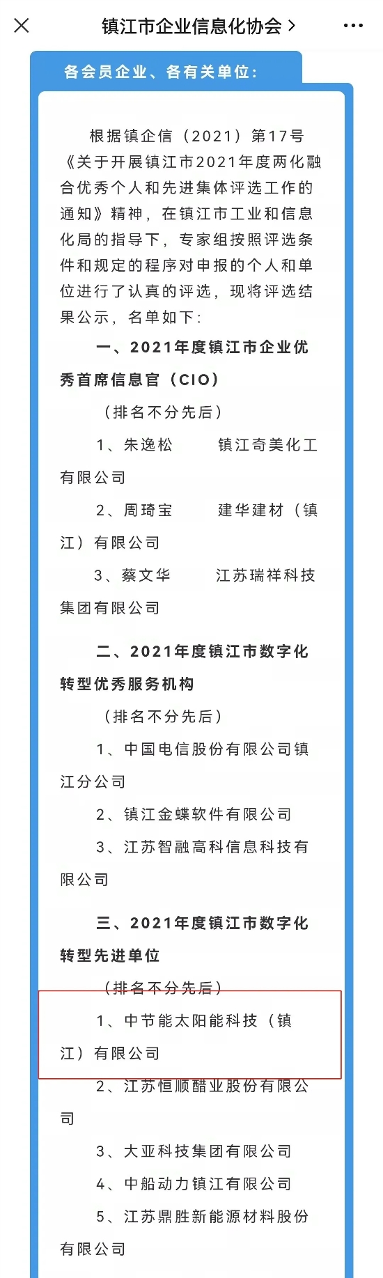 ? ? 根据镇企信(2021)第17号《关于开展镇江市2021年度两化融合优秀个人和先进集体评选工作的通知》精神,在镇江市工业和信息化局的指导下,专家组按照评选条件和规定的程序对申报单位进行了认真的评选。镇江公司积极利用新一代信息技术发展新业态、新模式,在企业数字化转型、智能制造、工业互联网平台建设等方面,以及在行业应用、管理成效等方面走在行业前列,具有良好的示范作用。