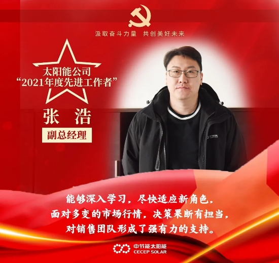 ? ? 值此新春佳节即将来临之际,【节能家园】开设“2022,用奋斗点亮幸福”专题,对公司2021年度优秀员工进行专题宣传,第六期走进太阳能公司先进个人与太阳能公司先进单位和镇江公司突出贡献奖,共同见证他们的奋斗之旅与骄傲荣光。