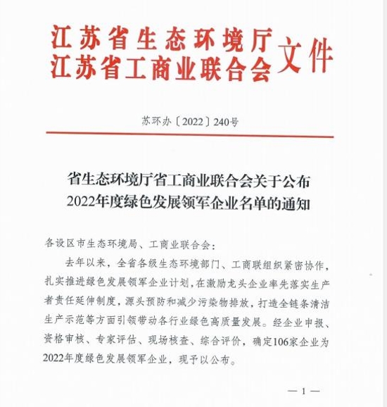 ? ? ? ?近日,经江苏省生态环境厅、全省各级生态环境部门、工商联组织联合评审,镇江公司荣获2022年“江苏省绿色发展领军企业”称号。此次获奖是对镇江公司深入践行习近平生态文明思想,将减污降碳源头治理融入企业发展战略,积极参与碳达峰碳中和计划,强化减污降碳协同增效的充分认可。