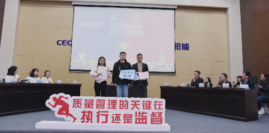 ? ? ? ?从对方开篇立论到攻辩环节再到盘问、自由辩论环节,都妙语连珠、金句频出。双方陈词精辟犀利、滴水不漏,博得现场观众的阵阵掌声,将比赛推向了一个又一个高潮。在总结陈词环节中,双方四辩针对对手逻辑上的漏洞逐一回击,思虑清晰。经过现场评委及观众评定,最终由正方代表队“群英荟萃队”获得本场辩论的胜利。电池中心质量部许阳和组件中心技术部刘鹏获得“最佳辩手”称号。
