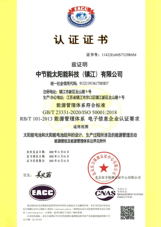 ? ? ? ?此次能源管理体系认证,镇江公司领导高度重视,由组件中心主导,安健环管理部、工程部、电池中心、财务部全程积极深度参与,经营管理部、产品研发部、人力行政部、信息部、董事会办公室(风控部)等相关部门通力协作。能源管理体系认证证书的取得是对镇江公司节能减排工作的肯定,代表镇江公司在能源管理水平上迈向了新的台阶,同时也是公司积极稳妥推进碳达峰碳中和的重要举措。