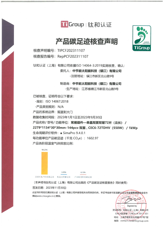 ??? 近日,镇江公司三款产品成功获得CEC6-54THV(黑框黑背)、CEC6-54THV(白框白背)、CEC6-72TDHV碳标签,三款产品碳标签的获得是对镇江公司节能减排、低碳环保工作水平的权威认证,为公司组件产品海外销售提供有力支持,向“双碳”战略目标迈出了坚实的一步。