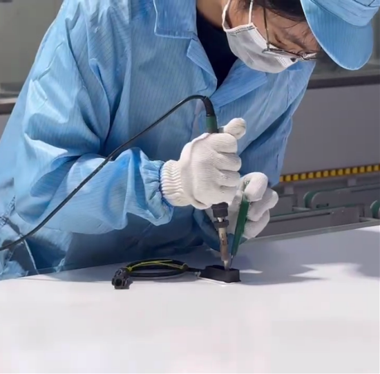 这是一双被笨重手套藏起来的秀气的手,这也是一双在镇江公司光伏组件生产过程中至关重要的手,这双手柔软却坚毅,这双手把接线盒和汇流条焊接在一起,连接太阳能组件产生的电力与外部线路,确保每一瓦电力都能安全、高效地传递,牢固地守护着光伏组件电力输送的重要一关。