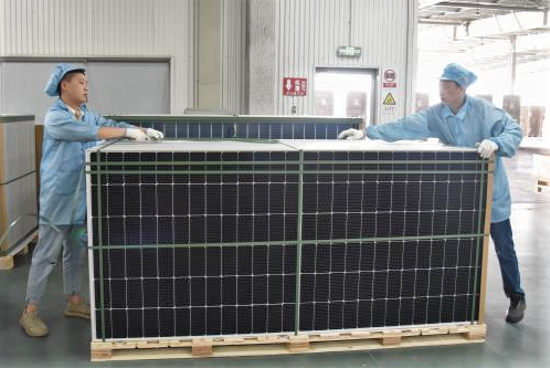这里是组件出厂的最后一关,这里是与“山”搏斗的地方,光伏组件成品叠成“巨石”、堆成“大山”。他们却视“巨石”如珍宝,为“巨石”罩上最后一层防护,确保组件在运输过程中不受外部环境的影响。他们抚摸着每一块组件,希望每一块组件都平安抵达,发挥它们的作用,为世界带来绿色电力。