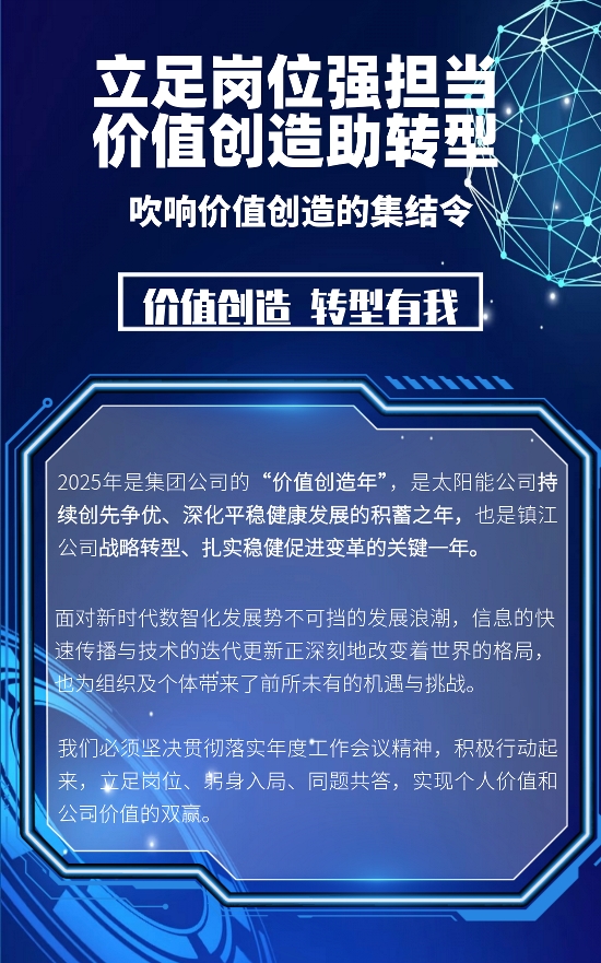 让我们进一步转变作风、自我变革、深入挖潜、躬身入局、提升方法、转化实效,持续创先争优,争做价值创造的放大器,携手锻造镇江公司科技转型新优势,助力太阳能公司平稳健康发展再上新台阶。