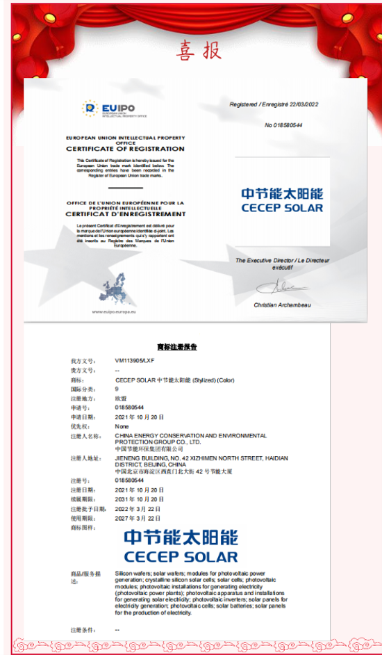 Good News! Successful Registration of the "CECEP SOLAR" Trademark in the EU and Japan!
